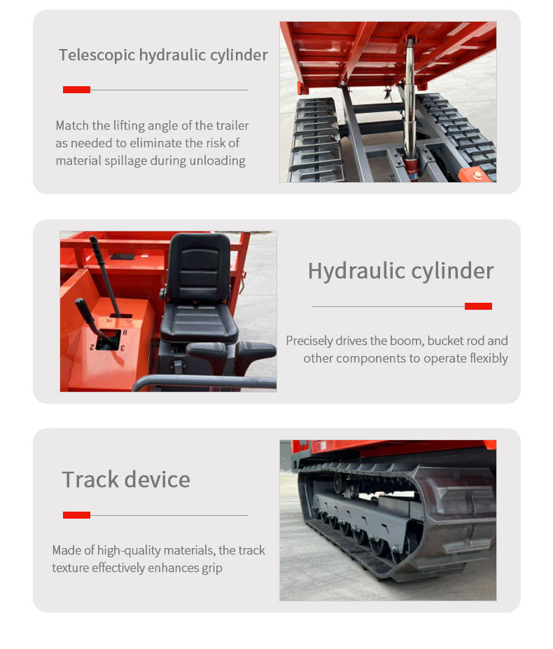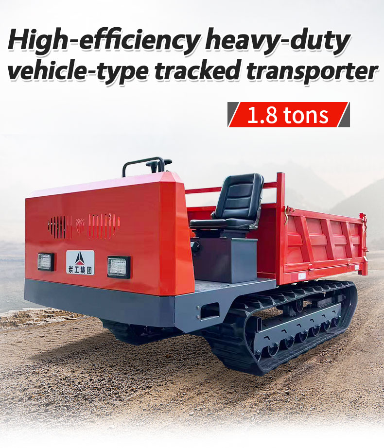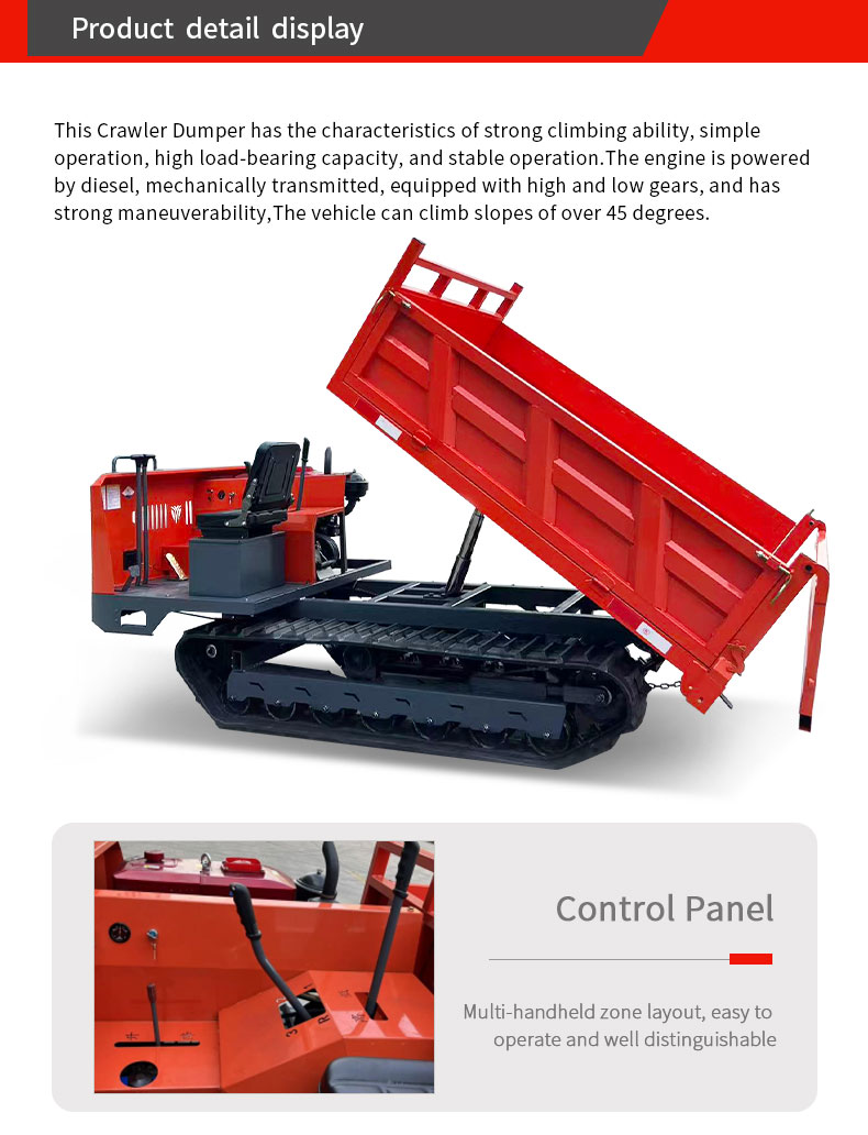 This crawler dumper features strong climbing ability, easy operation, high loading capacity and stable performance. It is powered by a diesel engine with mechanical transmission and high-low gear shifting, delivering excellent maneuverability. It can climb slopes over 45 degrees.