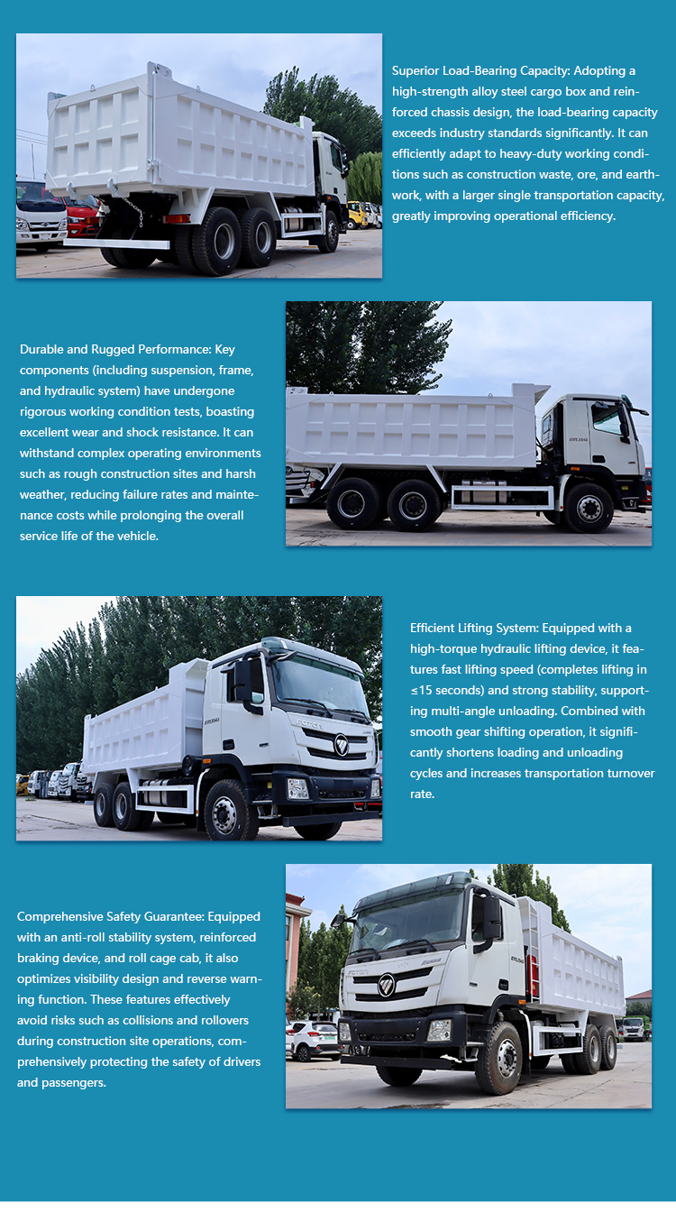 Engineered for demanding haulage and construction applications, this new Foton Auman heavy dump truck features a robust 6×4 drive configuration, a reliable diesel engine meeting Euro 4 standards, and a FAST manual gearbox for smooth, durable shifting. Designed with right-hand steering and equipped with an engine rear camera for enhanced safety and visibility, it offers exceptional customization options to suit specific project requirements. Ideal for mining, infrastructure development, and large-scale material transport, it combines power, durability, and operator convenience in a heavy-duty package.