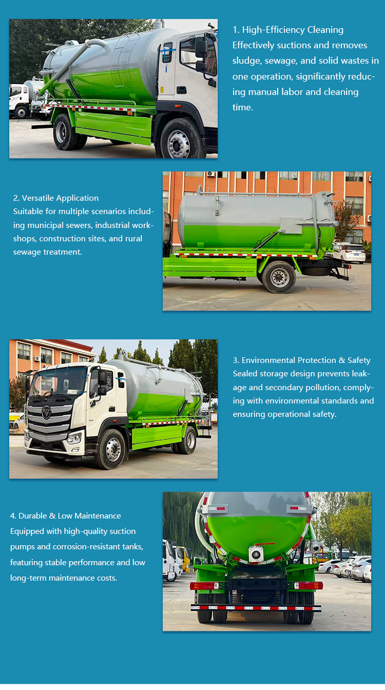 This heavy-duty vacuum truck features a 13-cubic-meter liftable tank and an openable rear lid for efficient discharging and easy cleaning. Powered by a manual diesel engine, it is designed for high-performance sewage suction, sludge removal, and industrial waste transport. Factory direct customization ensures adaptability to specific operational requirements, making it ideal for municipal sanitation, wastewater treatment plants, and environmental maintenance tasks.
