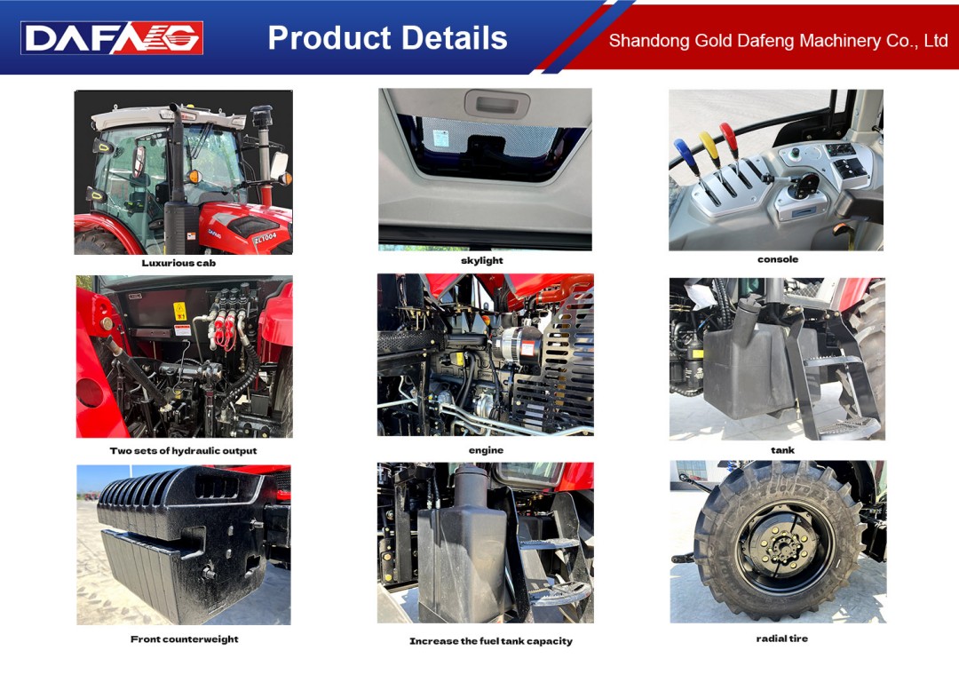YTO100HP four-cylinder engine (National II), 12-inch independent double-acting clutch, hydraulic clutch assist, TDF16+8 fast and slow gears (helical gears), PTO: 540/1000, rear wheel infinitely adjustable, flat floor and safety frame, Xu wheel 12.4-24/16.9-34, two sets of hydraulic output, double high-pressure lifter, suspension components, left and right guard steel plates, front counterweight 10 pieces 40 kg/piece, rear counterweight one layer 160 kg