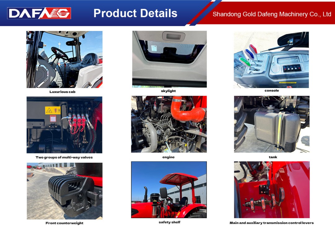 12+12 shuttle shift, dual-acting 11-inch clutch, 14.9-30/9.5-24 tires, differential lock, hydraulic steering, 540/760 rpm power output, front and rear counterweights, strong lift and lowering, two multi-way valves, safety frame with flat floor, enlarged and reinforced gearbox, thickened half-pipes, enlarged brakes, adjustable front and rear track, dual fuel tanks, four-wheel drive.