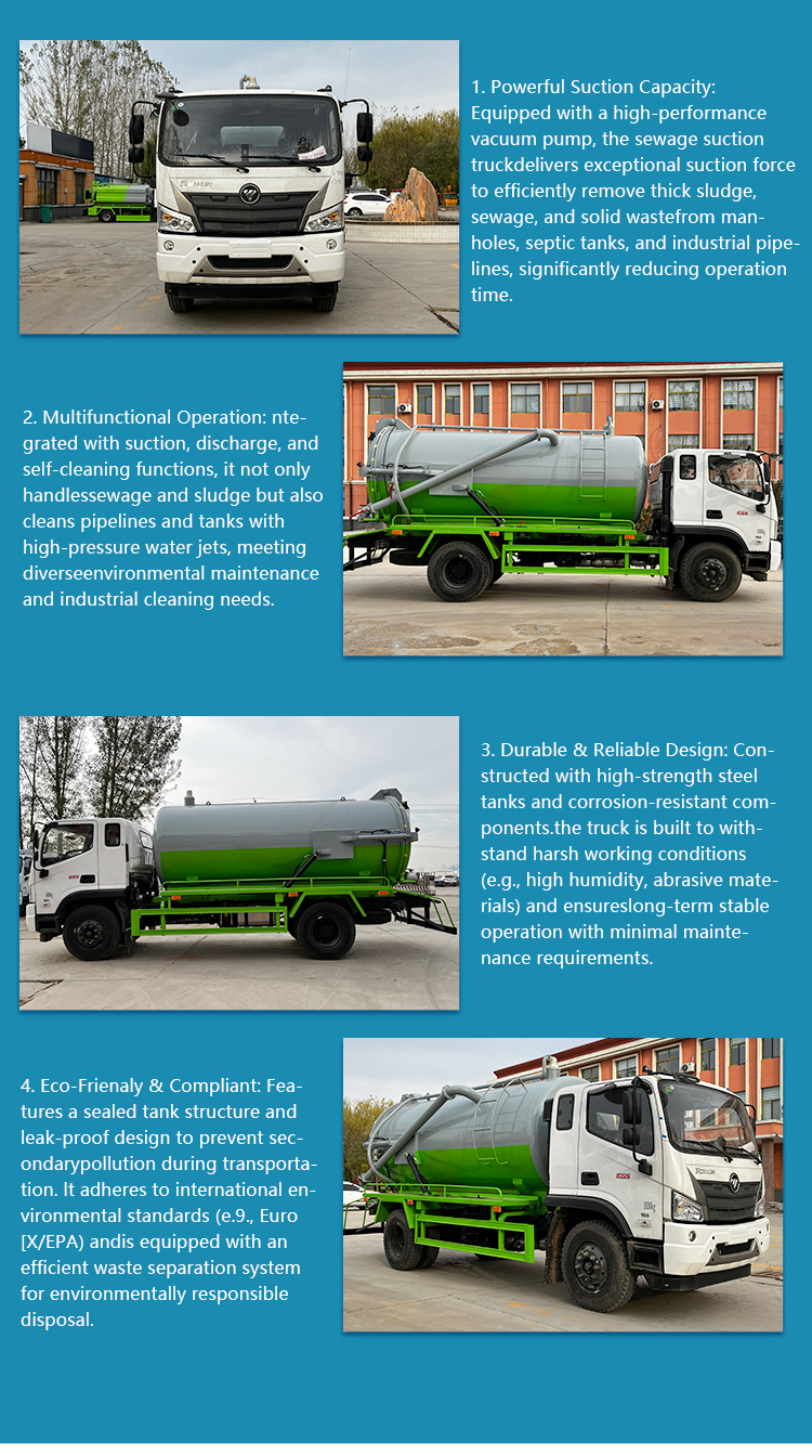 • Foton Vacuum Sewage  Truck-8m Capacity Vacuum Pump Diesel Euro 3 150-250hp for Municipal Sewage Cleaning | Customizable