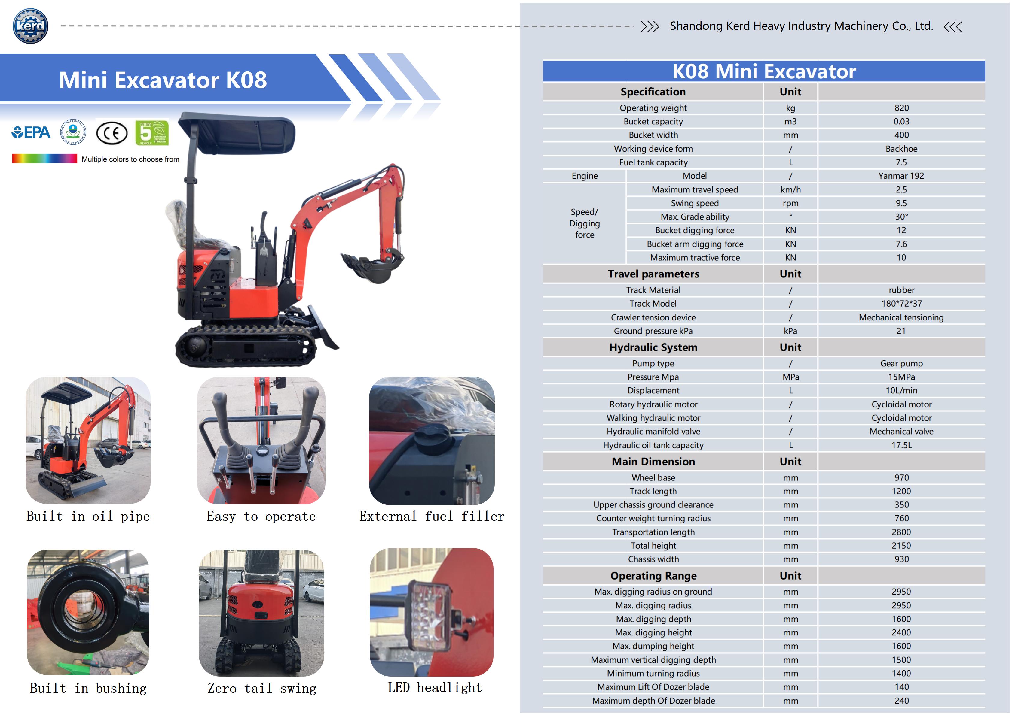 The K08 features a zero-tail swing design, allowing safe and flexible operation in confined areas. It comes with rubber tracks to reduce ground pressure and protect the working surface. The machine is built with a reasonable layout, including built-in oil pipes, external fuel filler, and LED headlights for improved convenience and safety. The compact structure ensures easy maintenance and user-friendly operation.