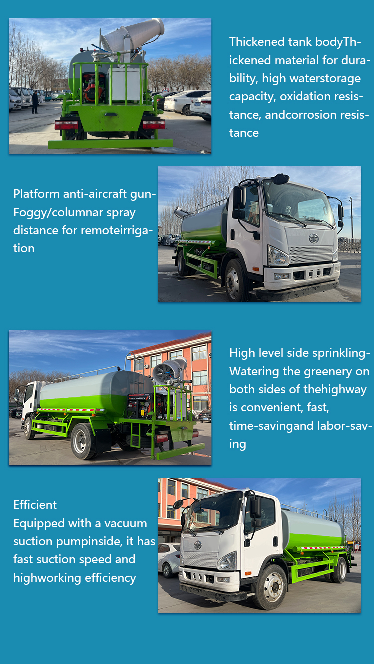 This JieFang 4x2 Landscaping Water Tank Truck offers a cost-effective solution for municipal and agricultural watering needs. With a 12 cubic meter (12cbm) capacity tank, it is ideal for garden irrigation, road dust suppression, and emergency fire-fighting water supply. Powered by a reliable Euro 5 diesel engine and equipped with a manual transmission, this truck delivers excellent fuel efficiency and durable performance. Whether for urban landscaping projects or rural water transport, this low-price water tanker ensures reliable operation and versatile functionality at an affordable cost.