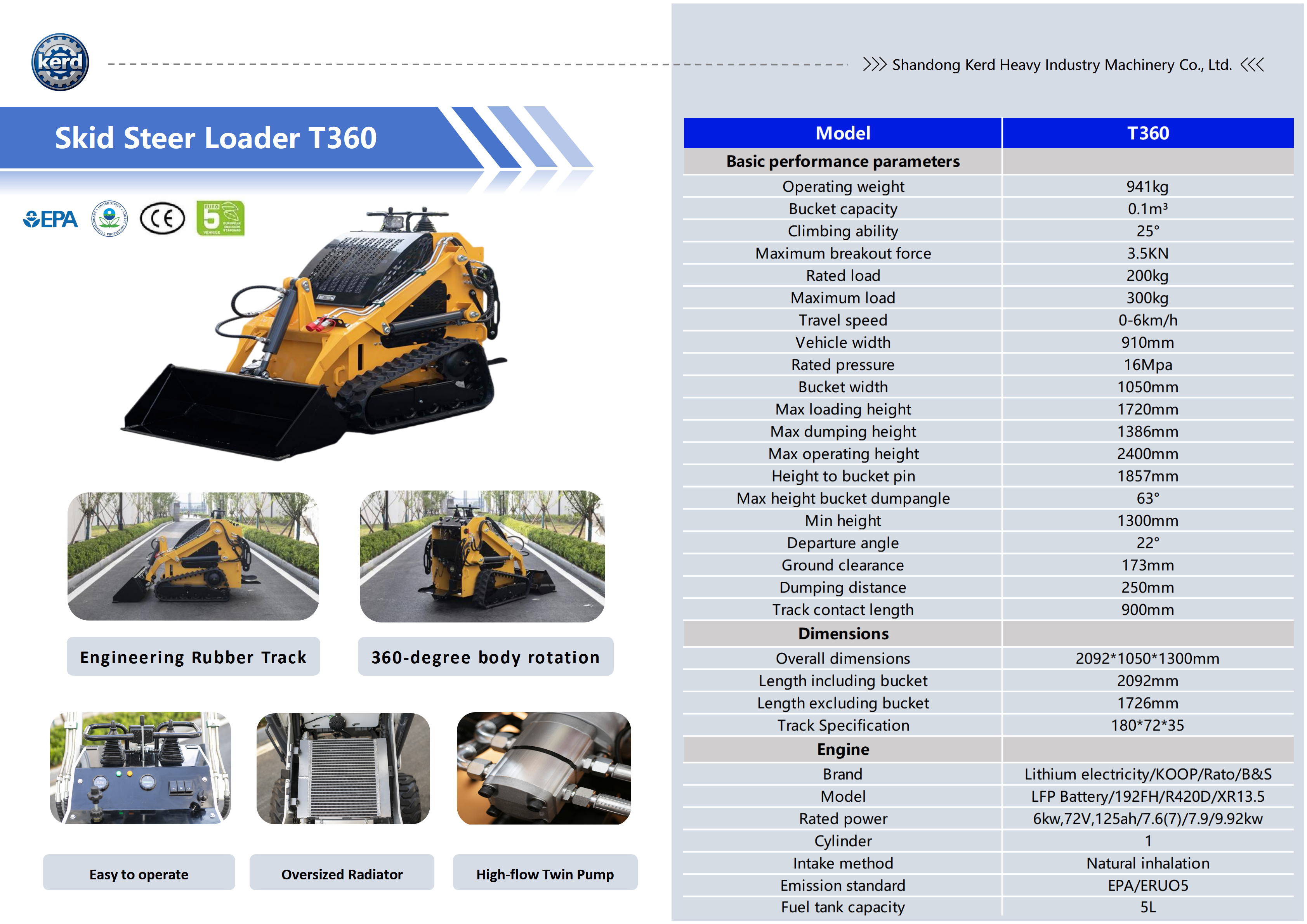 The T360 Skid Steer Loader is a compact tracked mini loader ideal for narrow-space operations. Featuring 360-degree body rotation, engineering rubber tracks, and a lithium battery power system, it offers a rated load of 200kg, max breakout force of 3.5KN, and EPA/ERUO5 emission standards. With easy operation, an oversized radiator, and a high-flow twin pump, it’s perfect for landscaping, construction, and small-scale material handling.