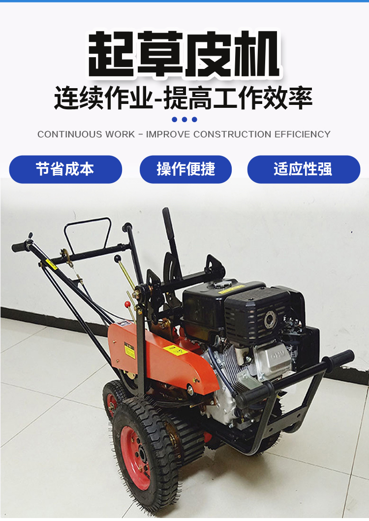This walk-behind sod cutter is powered by a gasoline engine and features an automatic cutting function. It is ideal for turf harvesting and transplanting in parks, sports fields, golf courses, and other large lawns. Working width: 40cm, cutting depth adjustable between 2-3cm, power: 9000W, net weight: 240kg. Stable operation and high efficiency.